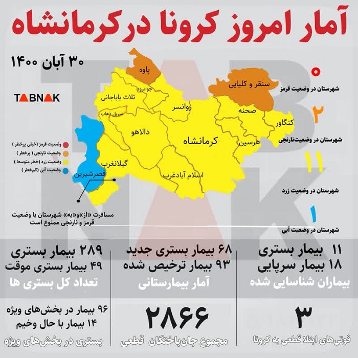 به گزارش تابناک کرمانشاه، طی شبانه‌روز گذشته یازده بیمار مثبت بستری و ۱۸ بیمار سرپایی کرونایی در استان کرمانشاه شناسایی شدند.