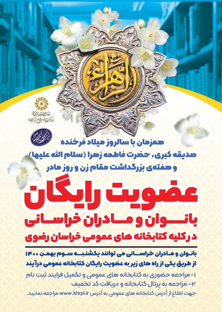عضویت رایگان زنان و مادران در کتابخانه های عمومی خراسان رضوی به مناسبت ولادت حضرت فاطمه زهرا(س) و روز زن به صورت رایگان اجر می شود.