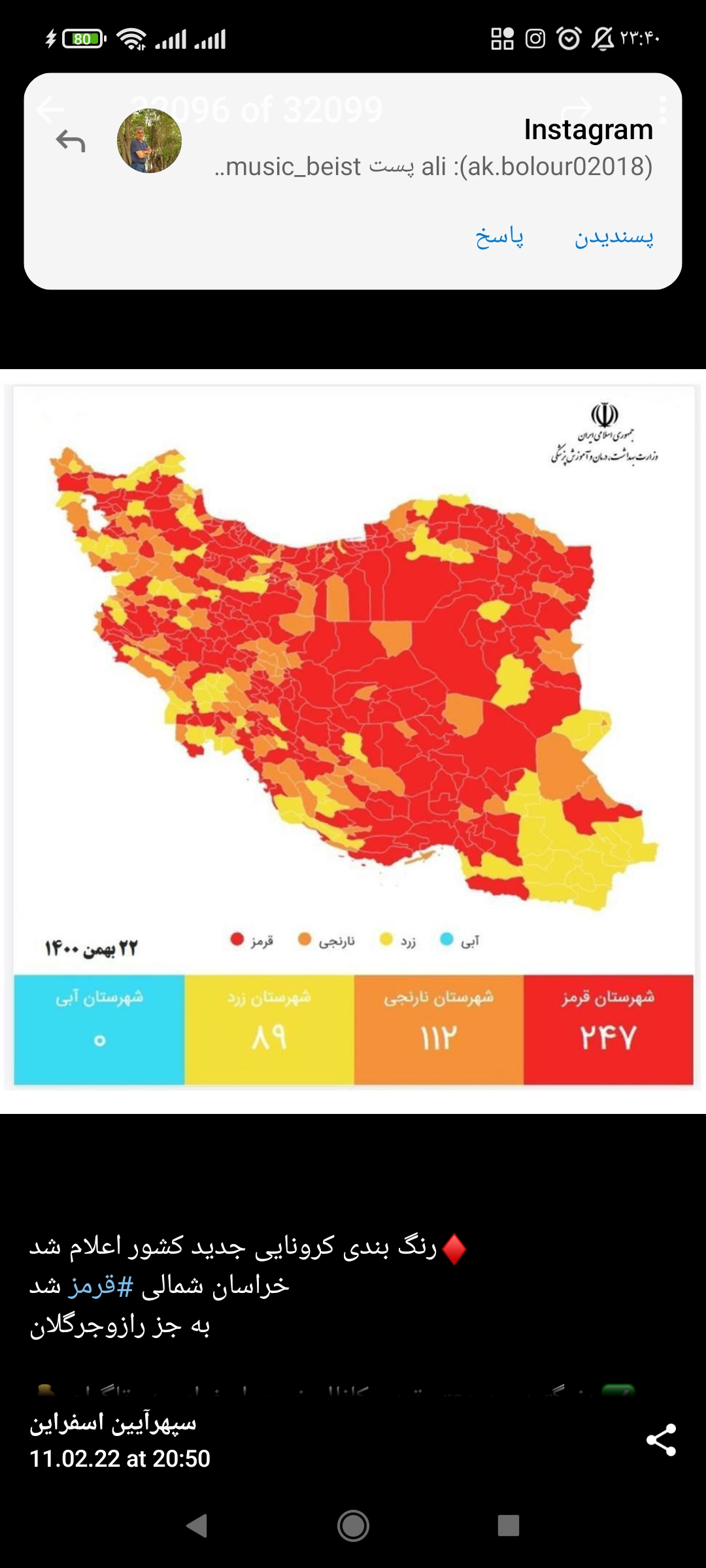 بر اساس همین گزارش، ۱۱۲ شهر در وضعیت نارنجی و ۸۹ شهر نیز در وضعیت زرد قرار گرفته اند.