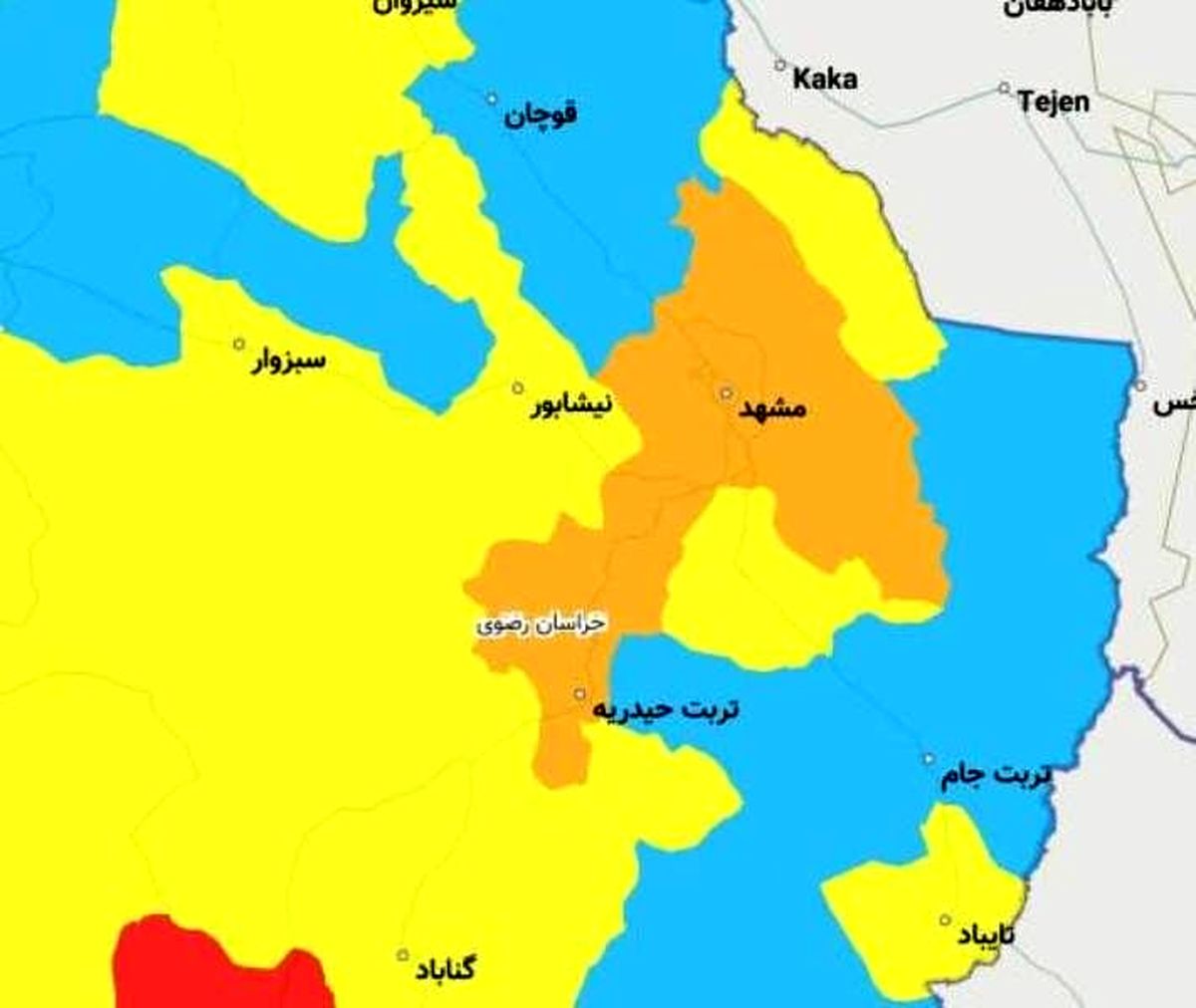 دکتر محمد پهلوان افزود: همچنین بر اساس اعلام وزارت بهداشت درمان و آموزش پزشکی، شهرهای بینالود، تربت جام، تربت حیدریه، چناران، خواف، سبزوار، سرخس، فریمان، کلات و مشهد در وضعیت نارنجی و سایر شهرها نیز در وضعیت زرد قرار دارند.
