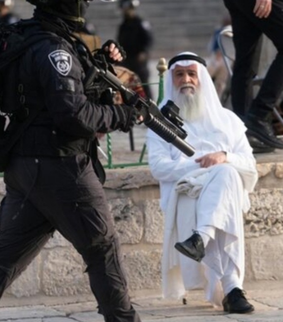لایه فوکوس در این عکس، پیرمرد را بغل کرده است و چند سوژه بی اهمیت جلوی او دارند با اسلحه راه میروند. جلوی سوژه اصلی، چند نظامی اشغالگرند که آمدهاند به بگیر و ببند در مسجدالاقصی و دستشان روی ماشه است. پشت سوژه اصلی هم چند صندلی خالیاند که احتمالاً قبل از ثبت این عکس، مردمی رویشان نشسته بودهاند که یا از ترس، یا با زور نظامیان اشغالگر صندلیهای صحن مسجدالاقصی را تنها گذاشتهاند و رفتهاند. پیرمرد اما نشسته است. بی اعتنا به سربازان و همه مردمی که صندلیهایشان را گذاشته و فرار کردهاند. آن هم با زبان بدنی که چند روز بعد از ثبت این عکس، تمام زوری که آن روز صهیونیستها گذاشته بودند برای تعرض و دستگیری را شکست داده و پیامی که باید به دنیا برسد را رسانده است.