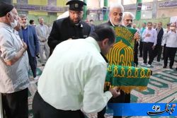 خادمان رضوی همچنین پرچم متبرک رضوی را بر سر تربت مرحوم آیت الله اعرافی امام جمعه فقید میبد بردند و ادای احترام کردند.