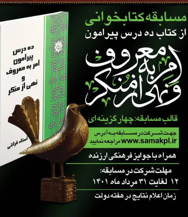 قرعه کشی نتایج مسابقه کتابخوانی از کتاب «ده درس پیرامون امر به معروف و نهی از منکر» در هفته دولت سالجاری انجام می شود. همچنین جوایز این مسابقه شامل بسته های فرهنگی ارزنده است.