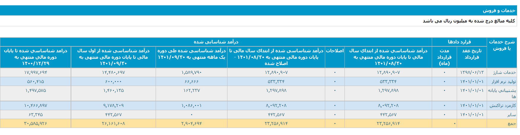 این نماد بورسی از حوزه کارمزد تراکنشها در آذرماه ۱۰۸ میلیارد و ۶۰۰ میلیون تومان، از خدمات شارژ بیش از ۱۵۸ میلیارد تومان، از پشتیبانی پایانهها ۱۶ میلیارد تومان و از تولید نرم افزار نیز ۶ میلیارد تومان دریافت کسب کرده است.