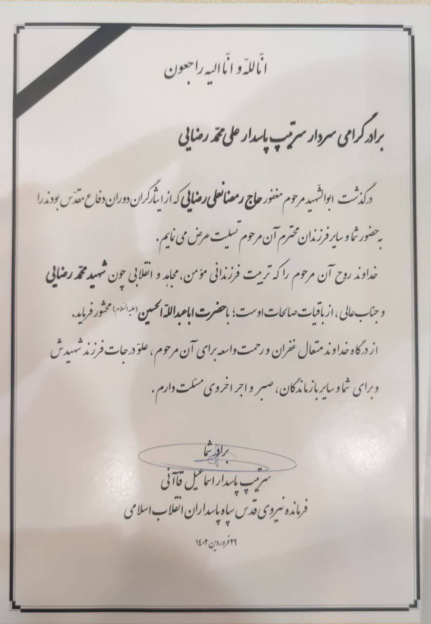 متن تسلیت سردار قاآنی در هجران ایثارگر و پدرشهید رضایی در مشهد