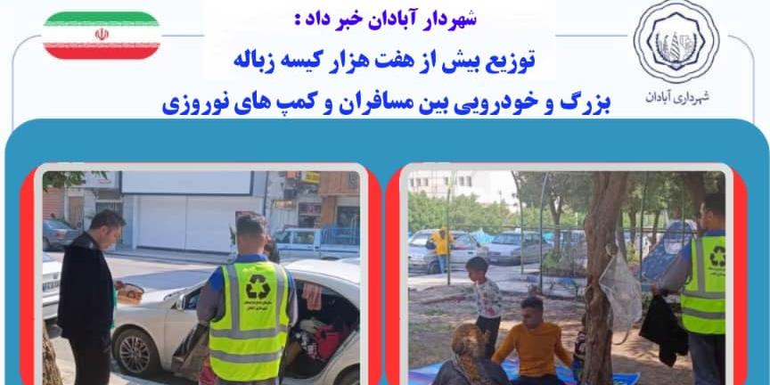 به گزارش روابط عمومی و امور بین الملل شهرداری آبادان، یاسین کاوه‌پور با اشاره به اقدامات سازمان مدیریت پسماند شهرداری آبادان در ایام نوروز، اظهار کرد: به منظور مدیریت هرچه بهتر پسماندهای تولیدی و جلوگیری از رهاسازی آنها در مکان های عمومی، از ابتدای نوروز تا کنون بیش از پنج هزار کیسه زباله بزرگ در محل های اسکان مسافران نوروزی از جمله کمپ ولیعصر (عج)  کمپ شهدای شهرداری  کمپ آموزش و پرورش و چادرهای مسافری مستقر در سطح شهر آبادان توزیع شده است.