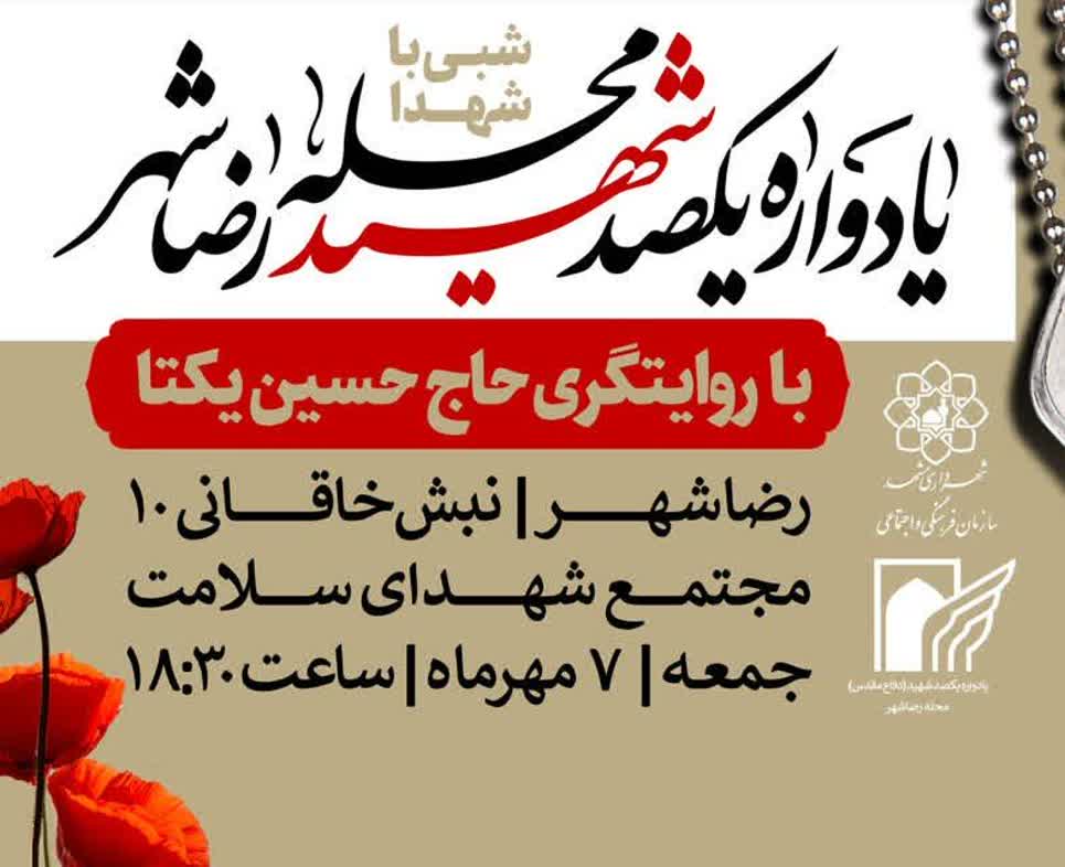 یادواره یکصد شهید محله رضاشهر مشهد در هفتم مهرماه ۱۴۰۲، ساعت ۱۸:۳۰ در مجتمع شهدای سلامت واقع در محله رضاشهر، نبش خاقانی ۱۰ برگزار میشود.