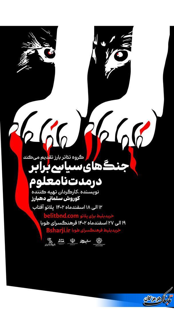 كوروش سلمانى دهبارز نويسنده كارگردان و تهيه كننده اثر گفت :نمايش جنگهاى سياسي برابر در مدت نامعلوم بعد از اجراى پلاتو آفتاب به فرهنگسراى طوبا خواهد رفت واز ١٩اسفند اجراهاى خود را در آن سالن تا اواخر اسفند ماه ادامه خواهد داد.