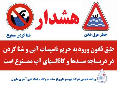 سرپرست شرکت بهرهبرداری مارون با اشاره به اینکه نصب این تابلوها و نیوجرسی ها در مجموع در سال های اخیر سهم به سزایی در کاهش بروز خطراتی همچون سقوط در کانالهای آبیاری و غرق شدگی در پی داشته است، عنوان کرد: در راستای اقداماتی که به منظور جلوگیری از بروز حوادث احتمالی صورت گرفته می توان به ارسال اطلاعیه درخصوص رعایت موارد ایمنی شبکه های آبیاری و ممنوعیت شنا در آن به شهرداریها، بخشداریها، دهیاریها و شورای اسلامی مناطق مجاور با شبکه های آبیاری اشاره کرد که خوشبختانه با استقبال خوبی از سوی مسئولان محلی آن مناطق رو برو شده ایم.