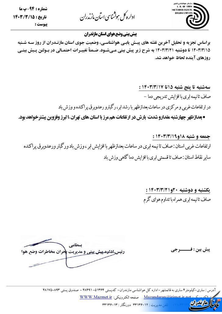 به گزارش تابناک مازندران ، اداره کل هواشناسی کشور وضعیت و متوسط دمای مازندران تا هفته آینده و همچنین وضعیت جوی کشور را به این شرح اعلام کرد: