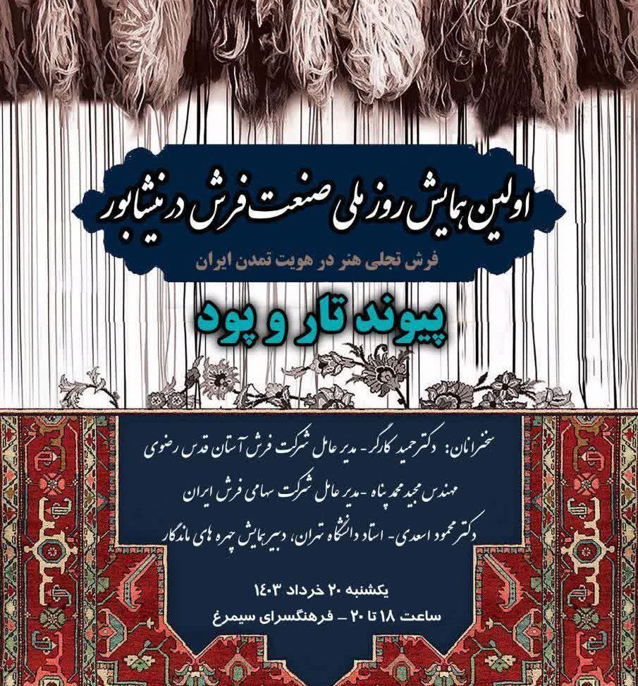 به گزارش تابناک رضوی، اتحادیه فروشندگان فرش، پتو و موکت شهرستان نیشابور اولین همایش روز ملی فرش را با عنوان "پیوند تار و پود" در فرهنگسرای سیمرغ نیشابور برگزار می‌کند.