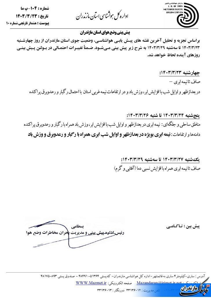 به گزارش تابناک مازندران ، اداره هواشناسی مازندران وضعیت جوی و متوسط دمای مازندران تا هفته آینده را به این شرح اعلام کرد:
