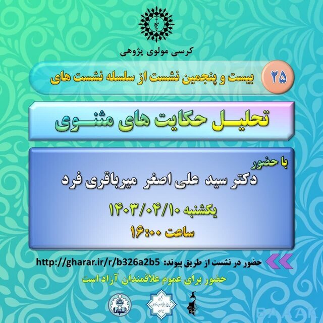 به گزارش تابناک اصفهان و به نقل از ایسنا، بیست و پنجمین نشست از سلسله نشستهای «تحلیل حکایتهای مثنوی» فردا، یکشنبه ۱۰ تیرماه ۱۴۰۳، بهصورت مجازی توسط کرسی مولوی پژوهی دانشگاه اصفهان برگزار میشود.