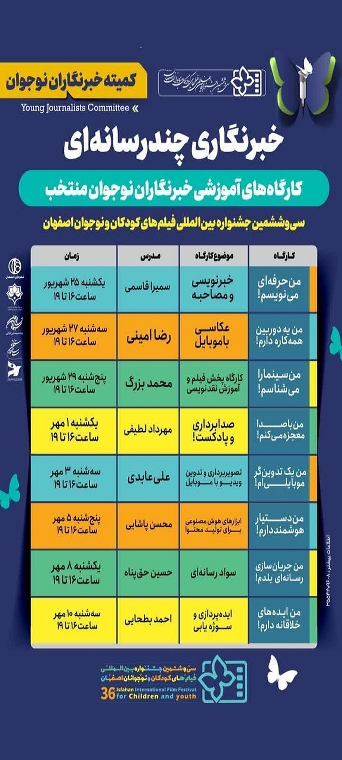 به گزارش کمیته خبرنگاران نوجوان سی و ششمین جشنواره بینالمللی فیلمهای کودکان و نوجوانان اصفهان، ویژه برنامه کارگاههای آموزشی این خبرنگاران از بیستوهفتم شهریور تا دهم مهرماه امسال در فرهنگسرای رسانه اصفهان برگزار میشود. به گزارش خبرگزاری تابناک به نقل از کمیته خبرنگاران نوجوان سی و ششمین جشنواره فیلم های کودکان و نوجوانان بخشی از این برنامه، کارگاه «خبرنویسی و مصاحبه» است که روز یکشنبه ۲۵ شهریورماه برگزار شد. در ادامه اما «عکاسی با موبایل» عنوان برنامه بعدی است که روز سهشنبه ۲۷ شهریورماه برگزار میشود. «کارگاه پخش فیلم و آموزش نقدنویسی» نیز عنوان کارگاه آموزشی دیگری است که روز پنجشنبه ۲۹ شهریورماه برای این نوجوانان تدریس میشود. یکشنبه یک مهرماه، خبرنگاران نوجوان «صدابرداری و آموزش ساخت پادکست» را میآموزند و «تصویربرداری و تدوین ویدئو با موبایل» و «ابزارهای هوش مصنوعی برای تولید محتوا» هم از سرفصلهای تدریسی در روزهای سهشنبه سه مهرماه و پنجشنبه پنج مهرماه است. دیگر کارگاههای آموزشی این نوجوانان، «سواد رسانهای» در روز یکشنبه هشت مهر و «ایدهپردازی و سوژهیابی» است که روز سهشنبه ۱۰ مهر برگزار میشود. خبرنگاران نوجوان پس از شرکت در این کارگاهها به استقبال جشنواره بینالمللی فیلمهای کودکان و نوجوانان میروند که امسال از ۱۴ تا ۱۹ مهرماه در اصفهان برگزار خواهد شد. این خبرنگاران پس از موفقیت در مرحله آزمون و مصاحبه از بین بیش از ۴۷۰ نوجوان متقاضی انتخاب شدهاند.