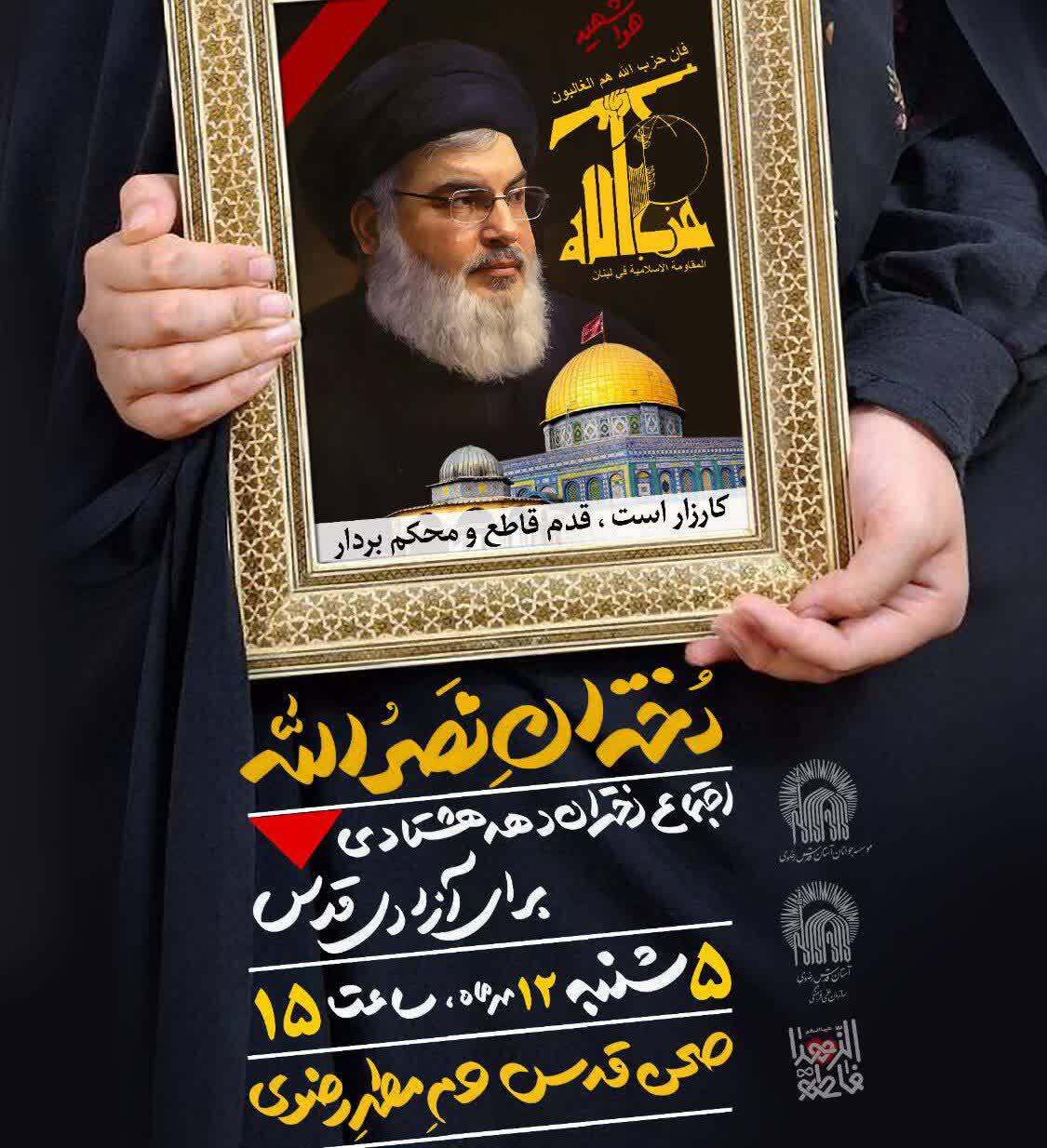 دختران دهه هشتادی ضمن تسلیت و گرامیداشت شهید سید حسن نصرالله به عنوان فردی خود ساخته، مجاهد و الگوی نسل جوان برای آزادی قدس شریف مورخ پنجشنبه ۱۲ مهرماه ساعت ۱۵ واقع در صحن قدس حرم مطهر رضوی گرد هم میآیند.