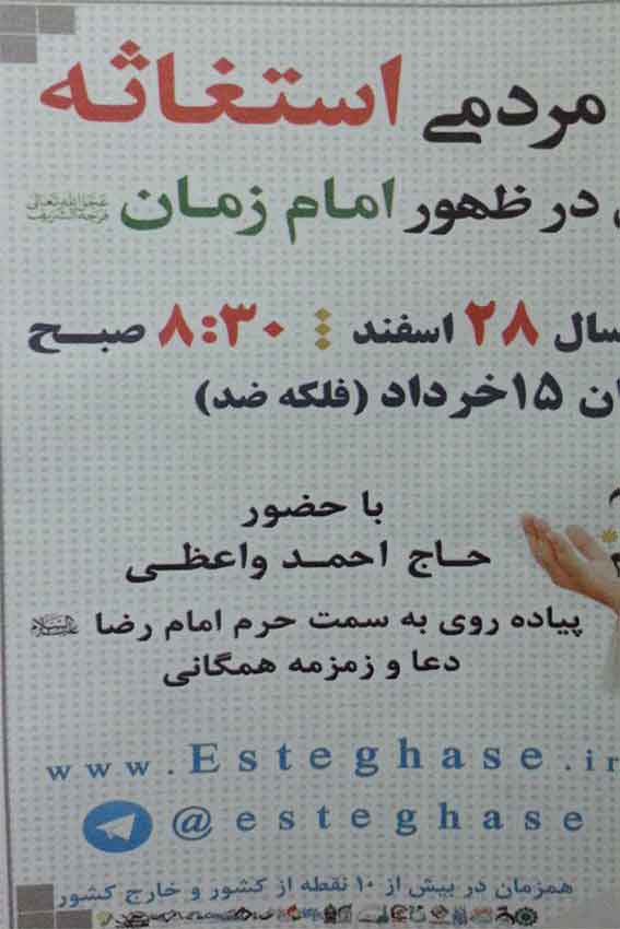 تجمع بزرگ مردمی استغاثه برای تعجیل در ظهور امام عصر (عج) در مشهد از ساعت ۸:۳۰ صبح روز جمعه ۲۸ اسفندماه از میدان پانزده خرداد به سمت حرم مطهر رضوی و با مداحی حاج احمد واعظی، برگزار میشود.