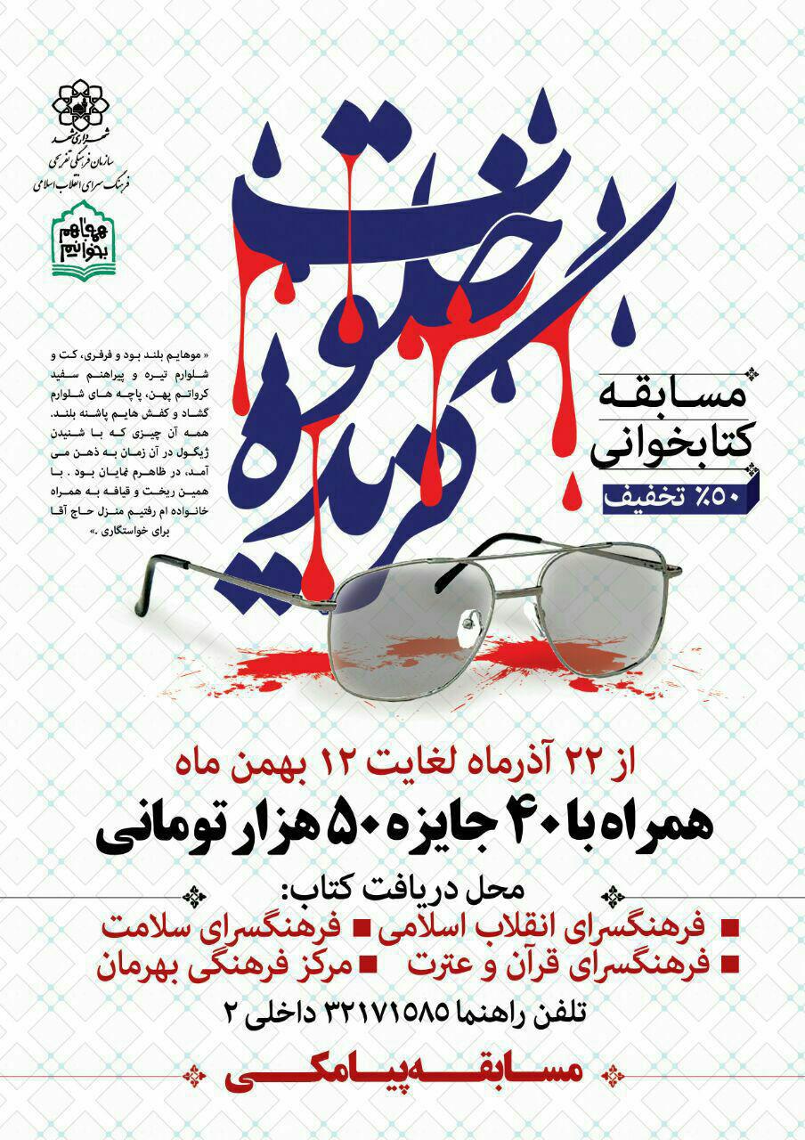 وی درخصوص نحوه برگزاری این مسابقه، افزود: علاقهمندان میتوانند این کتاب را با ۵۰درصد تخفیف و با قیمت ۳هزار تومان از این ۴فرهنگسرا، شهر کتاب، حسینیه یا مدرسه این شهید تهیه کنند، این مسابقه از ۱دی ماه آغاز شده و تا ۱۲بهمن ادامه دارد.