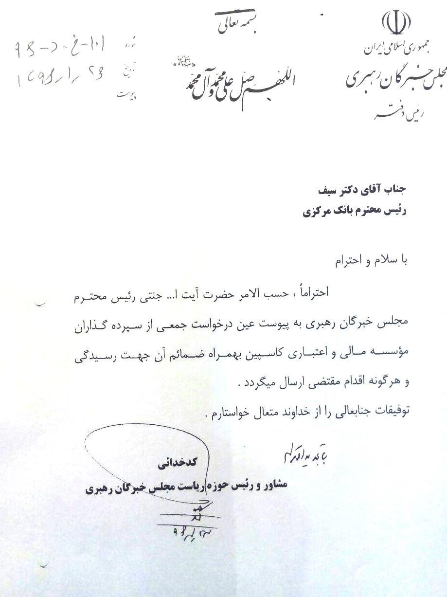 برهمین اساس آیت الله جنتی دستور پیگیری مشکلات سپرده گذاران کاسپین را به رئیس کل بانک مرکزی داده است. در نامه ای که کدخدایی مشاور و رئیس حوزه ریاست مجلس خبرگان رهبری به ولی الله سیف رئیس کل بانک مرکزی نوشته، آمده است که بانک مرکزی اقدامات لازم را جهت حل مشکلات سپرده گذاران کاسپین انجام دهند.