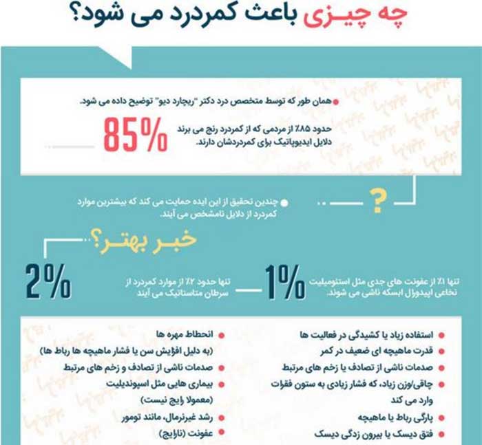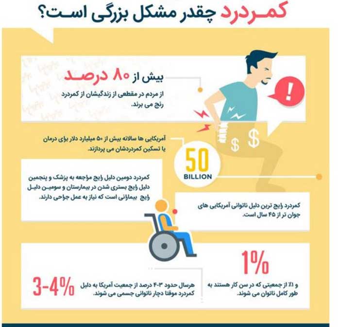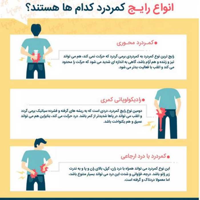 کمردرد میتواند به صورتهای و علل مختلفی میتواند بروز کند و معمولا بر اثر رگ به رگ شدن یا آسیبهای تصادفی بروز میکند و رزش سادهای مانند پیاده روی میتواند در کاهش کمردرد بسیار کمک کننده باشد زیرا افراد را از حالت نشسته خارج میکند و بدن آنها را در یک وضعیت خنثی و رو به بالا نگاه میدارد.