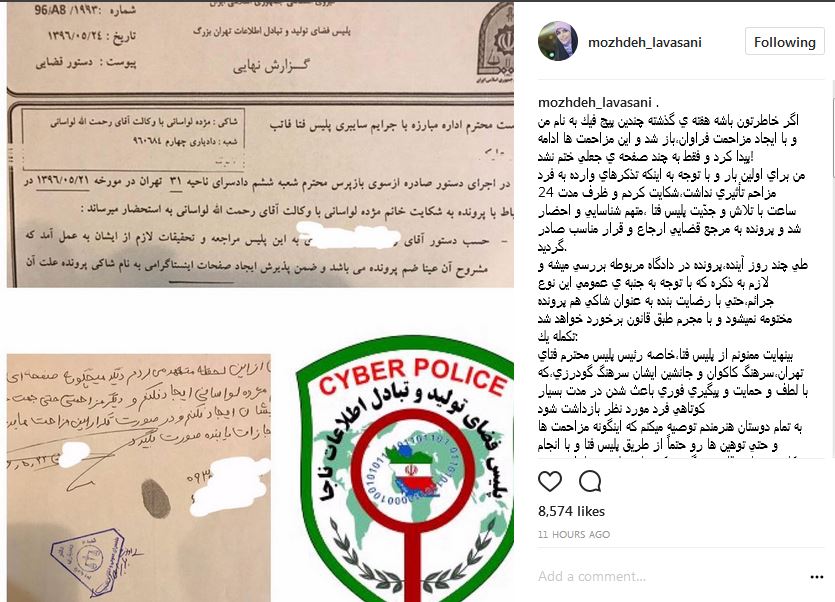 به تمام دوستان هنرمندم توصیه میکنم که اینگونه مزاحمت ها و حتی توهین ها رو حتماً از طریق پلیس فتا و با انجام شکایت به طور قانونی پیگیری کنند تا متخلفین مجازات شوند