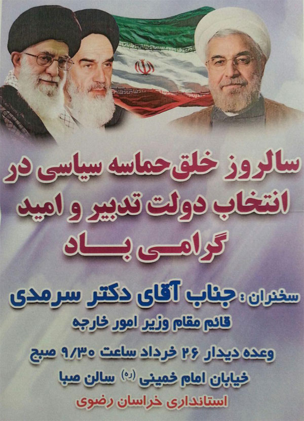 بنابراین گزارش بنر تبلیغاتی این جلسه بر روی پورتال استانداری نیز قابل مشاهده است و اشاره به حضور قائم مقام وزارت خارجه دارد درحالیکه پیشتر سخن از حضور دکتر ظریف در مشهد و در سالروز انتخاب دکتر روحانی بود.