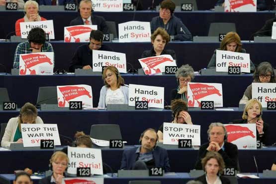 به گزارش تابناک : تعدادی از نمایندگان پارلمان اروپا در زمان سخنرانی امانوئل مکرون رئیس جمهور فرانسه در صحن این پارلمان، برگههایی که روی آن پایان جنگ در سوریه را خواستار شده بودند، به نمایش گذاشتند.