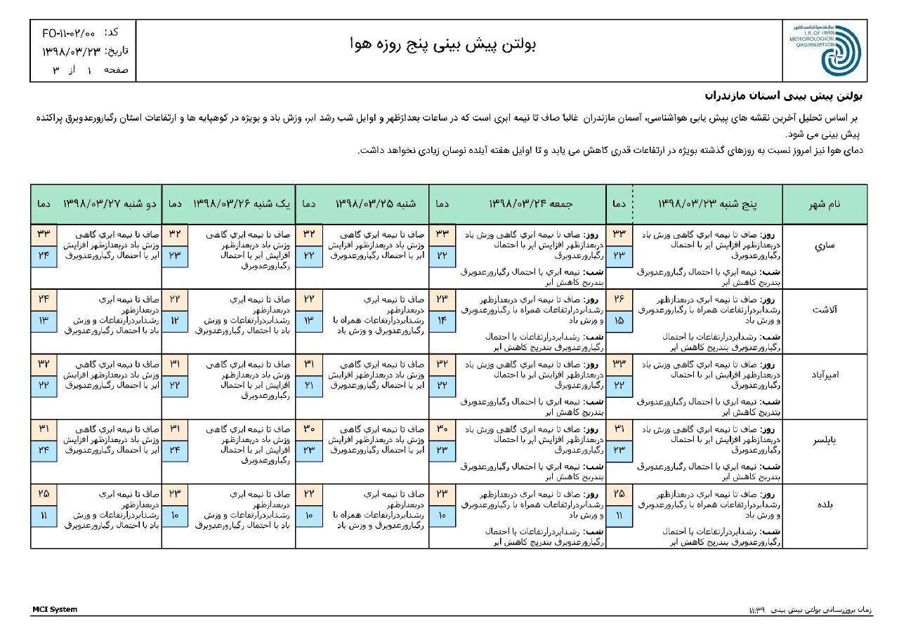به گزارش تابناک مازندران، اداره کل هواشناسی مازندران وضعیت جوی تا روز دوشنبه هفته آینده استان را پیش بینی کرد .
