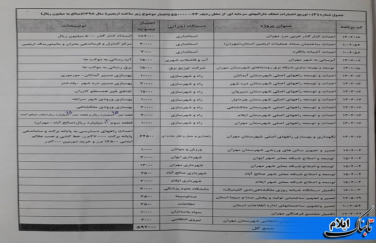 بعنوان مثال با وجود اینکه شهرستان سیروان وچرداول بعنوان دوشهرستان اصلی مسیر اربعین وپیشانی استان از آنها یاد می شود اما رقم اعتبارات تخصیصی به آن نسبت به دیگر شهرستانها ناچیز وکاملا ناعادلانه است ،چرا باید درحالی که درهفته دولت سال گذشته کنارگذر غربی مهران افتتاح شد اما در سالجاری بیش از 18/4میلیارد اعتباربه آن  تخصیص یابد؟ اهمیت راه سرابله ایلام که هرماه تلفات جانی برجای می گذارد برای مسئولین این حوزه چقدر است ؟!