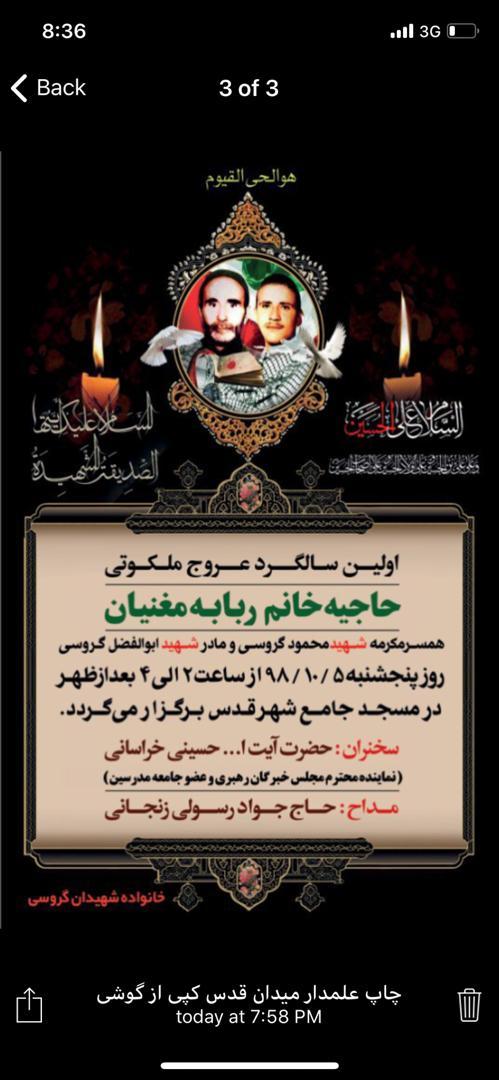 همزمان با اولین سالگرد درگذشت حاجیه خانم ربابه مغنیان همسر ومادر گراتقدر شهیدان گروسی، خانواده این مرحوم زمان و مکان برگزاری مراسم یادبود ایشان را اعلام کردند.
