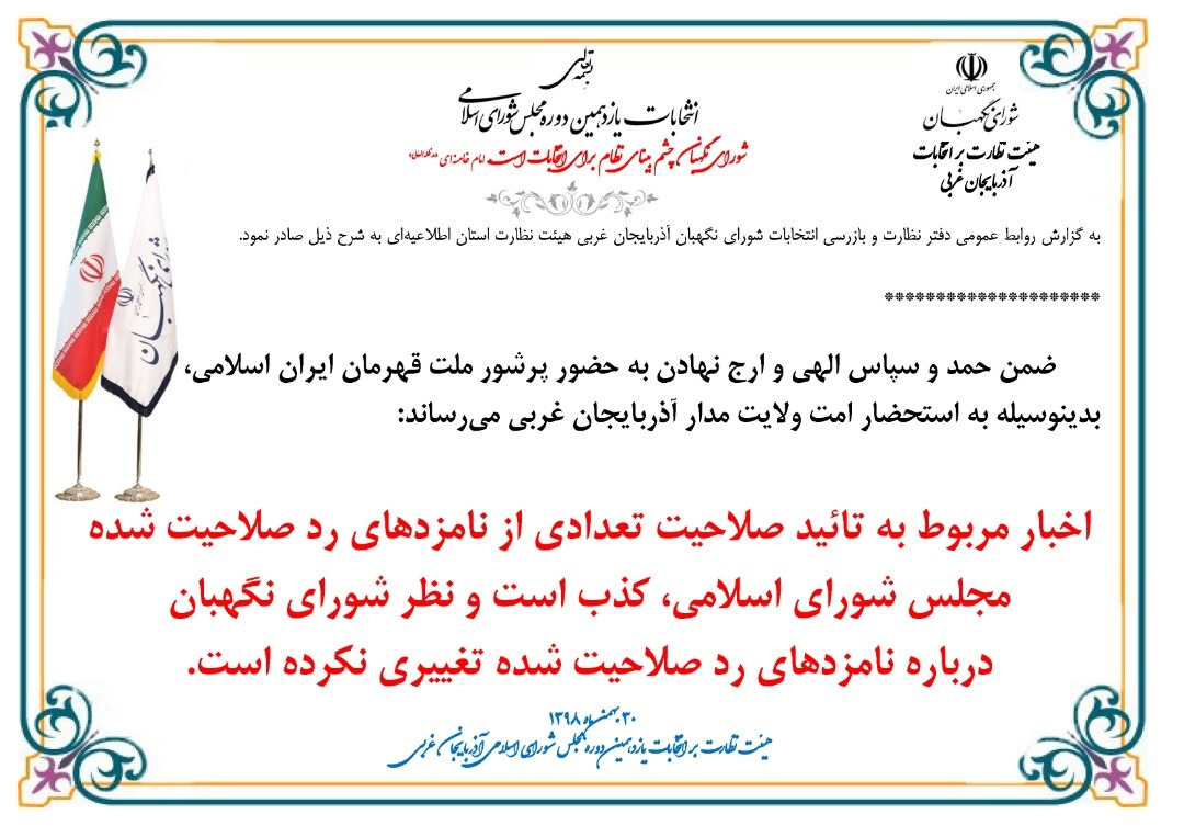 اخبار مربوط به تایید صلاحیت تعدادی از نمایندگان رد صلاحیت شده مجلس شورای اسلامی کذب است و نظر شورای نگهبان درباره نمایندگان رد صلاحیت شده تغییری نکرده است.