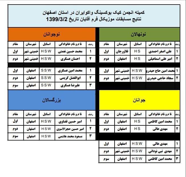 در بخش بانوان شهرستان های اصفهان، فلاورجان و نجف آباد و در بخش آقایان شهرستان های اصفهان، خمینی شهر و فلاورجان بهترین نتایج را به دست آورند.