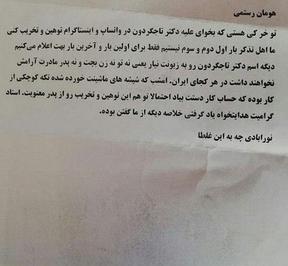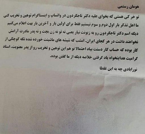 به گزارش تابناک کهگیلویه و بویراحمد ، در ساعت های اخیر خبری در فضای مجازی منتشر شد که ادعا شده است طرفداران غلامرضا تاجگردون نماینده گچساران و باشت در مجلس شورای اسلامی ضمن خرد کردن شیشه های خودروی یک از طرفداران ستار هدایتخواه نماینده اسبق بویراحمد و دنا، نامه ای تهدیدآمیز برای وی نوشتند و او و خانواده اش را تهدید کرده اند.