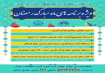 به گزارش مرکز ارتباطات شهرداری اسلامشهر، دارالقرآن شهرداری اسلامشهر با همکاری سازمان فرهنگی اجتماعی شهرداری نسبت به برگزاری ویژه برنامه های ماه مبارک رمضان به شرح ذیل اقدام نموده است: