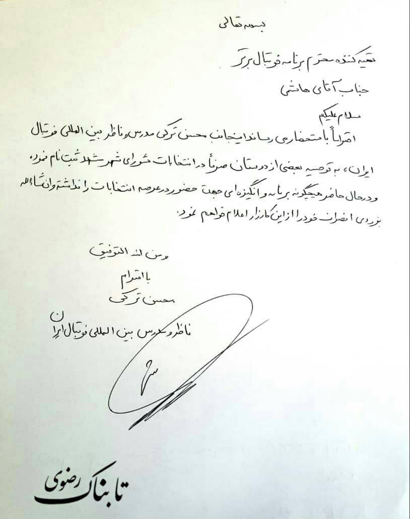 به گزارش تابناک رضوی، متن نامه دست نویس محسن ترکی داور پیشکسوت فوتبال کشور خطاب به هاشمی تهیه کننده برنامه فوتبال برتر به این شرح است: